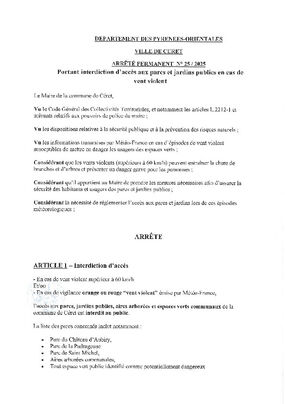 N°25-2025 INTERDISANT L'ACCES AUX PARCS ET JARDINS PUBLIC EN CAS DE VENT VIOLENT