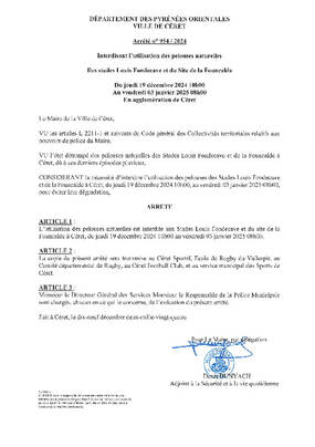 ARRETE 954/2024 INTERDISANT L'UTILISATION DES PELOUSES NATURELLES DES STADE FONDECAVE ET FONTCALDE JUSQU'AU 03/01/25