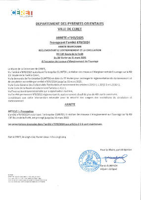 N°143-2025 PROROGATION ARRETE 870-2024 TRAVAUX ROUTE DE LA FORET DU 28 FEVRIER AU 31 MARS