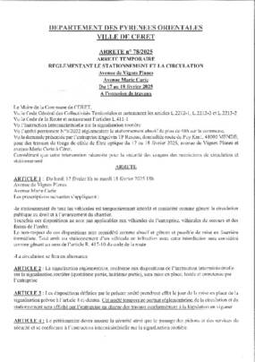 N°78-2025 TRAVAUX FIBRE OPTIQUE AVENUE VIGNES PLANES ET AVENUE MARIE CURIE DU 17 AU 18 FEVRIER