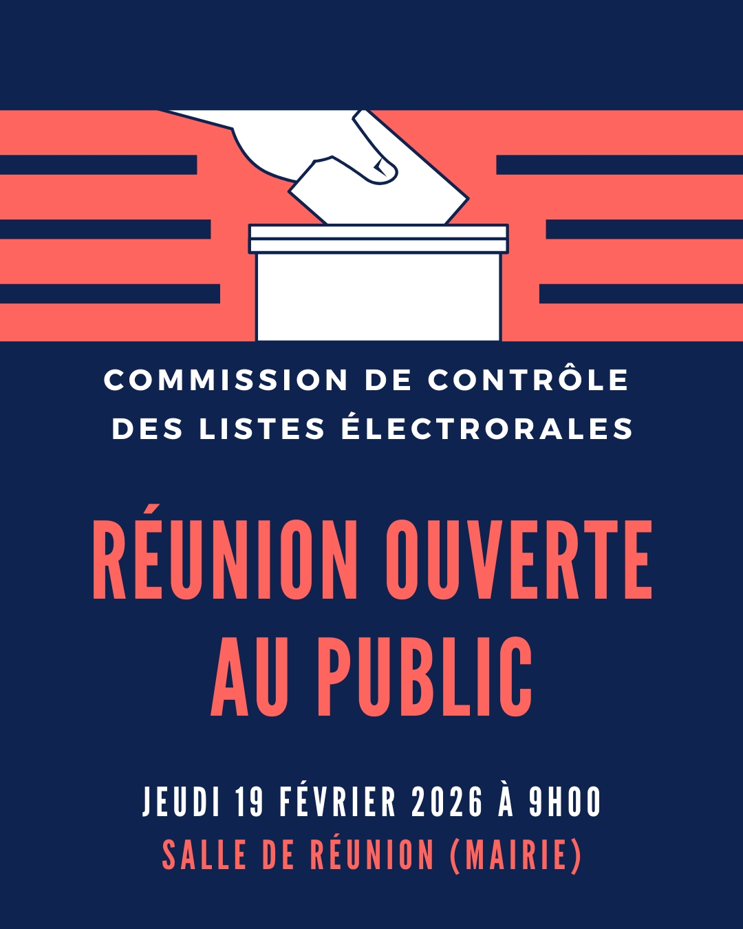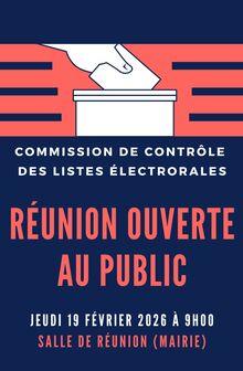 La prochaine réunion de la commission de contrôle des listes électorales se tiendra le jeudi 19 février 2026 à 9h00, en mairie, dans la salle de réunion.