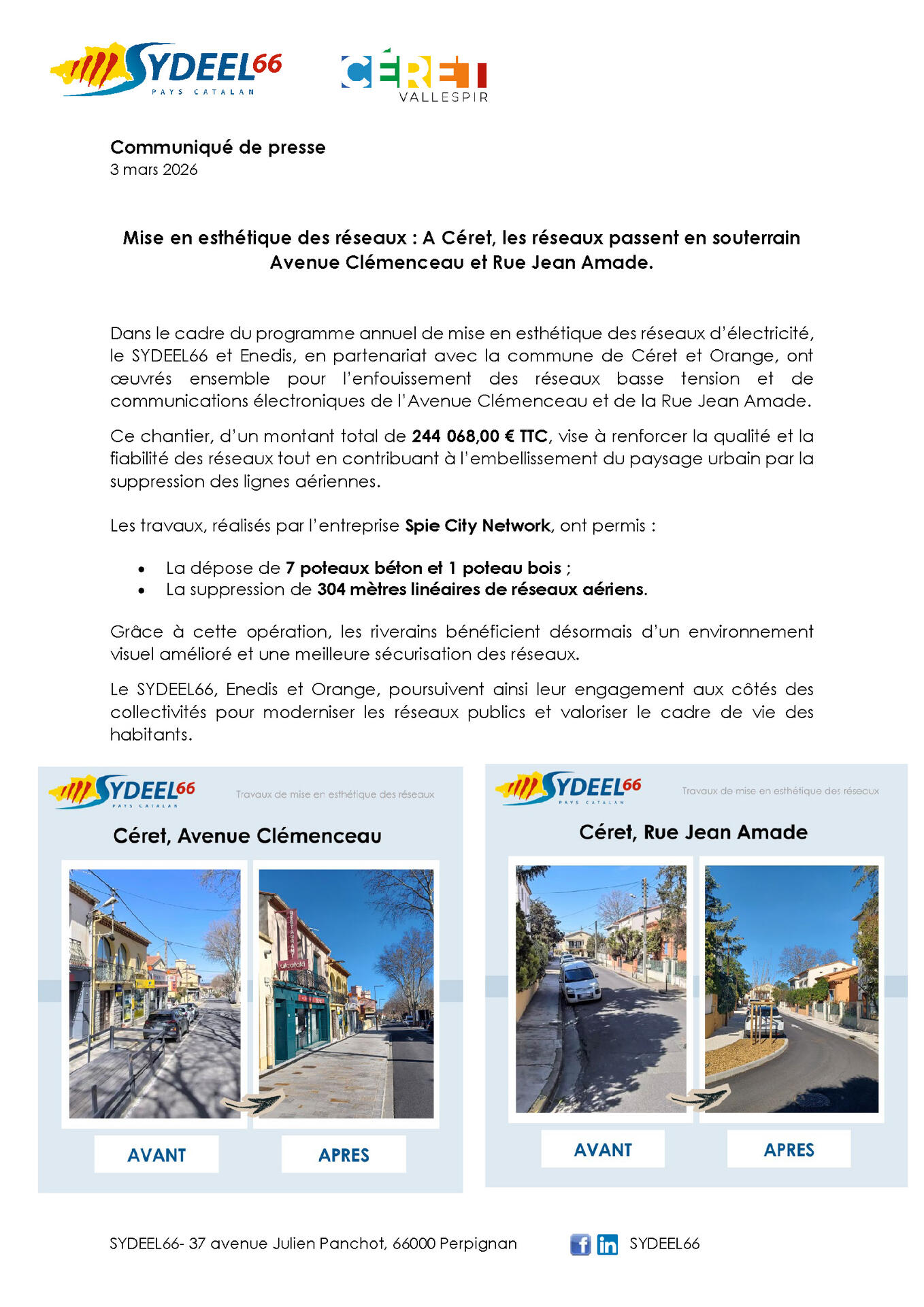 Mise en esthétique des réseaux : A Céret, les réseaux passent en souterrain Avenue Clémenceau et Rue Jean Amade.