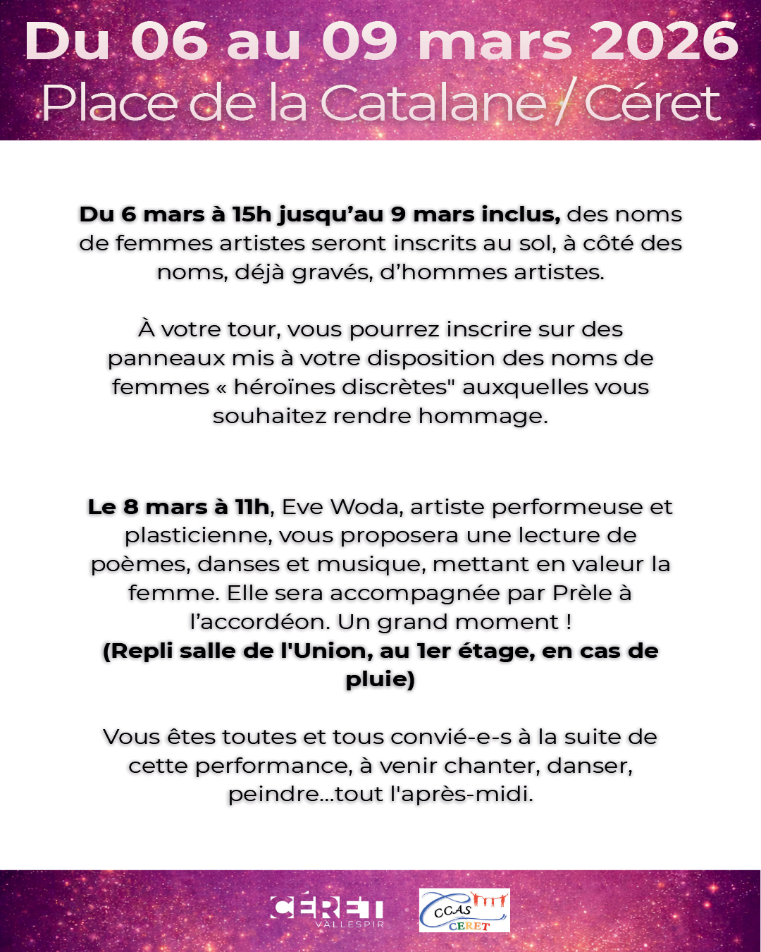 Du 6 mars à 15h jusqu'au 9 mars inclus, Place de la Catalane, des noms de femmes artistes seront inscrits au sol aux côtés de ceux déjà gravés. Le public pourra également rendre hommage à des « héroïnes discrètes » en inscrivant leurs noms sur des panneaux mis à disposition.